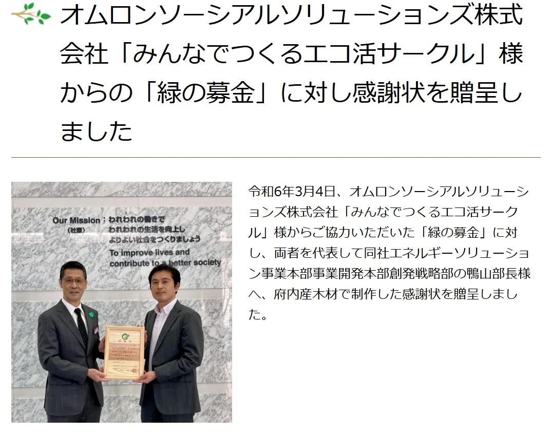 森林を守り育てる取り組みを積極的に推進されている「京都モデルフォレスト協会さま」に太陽光の電気を使うことで生まれた環境価値の一部を寄付させていただきました。